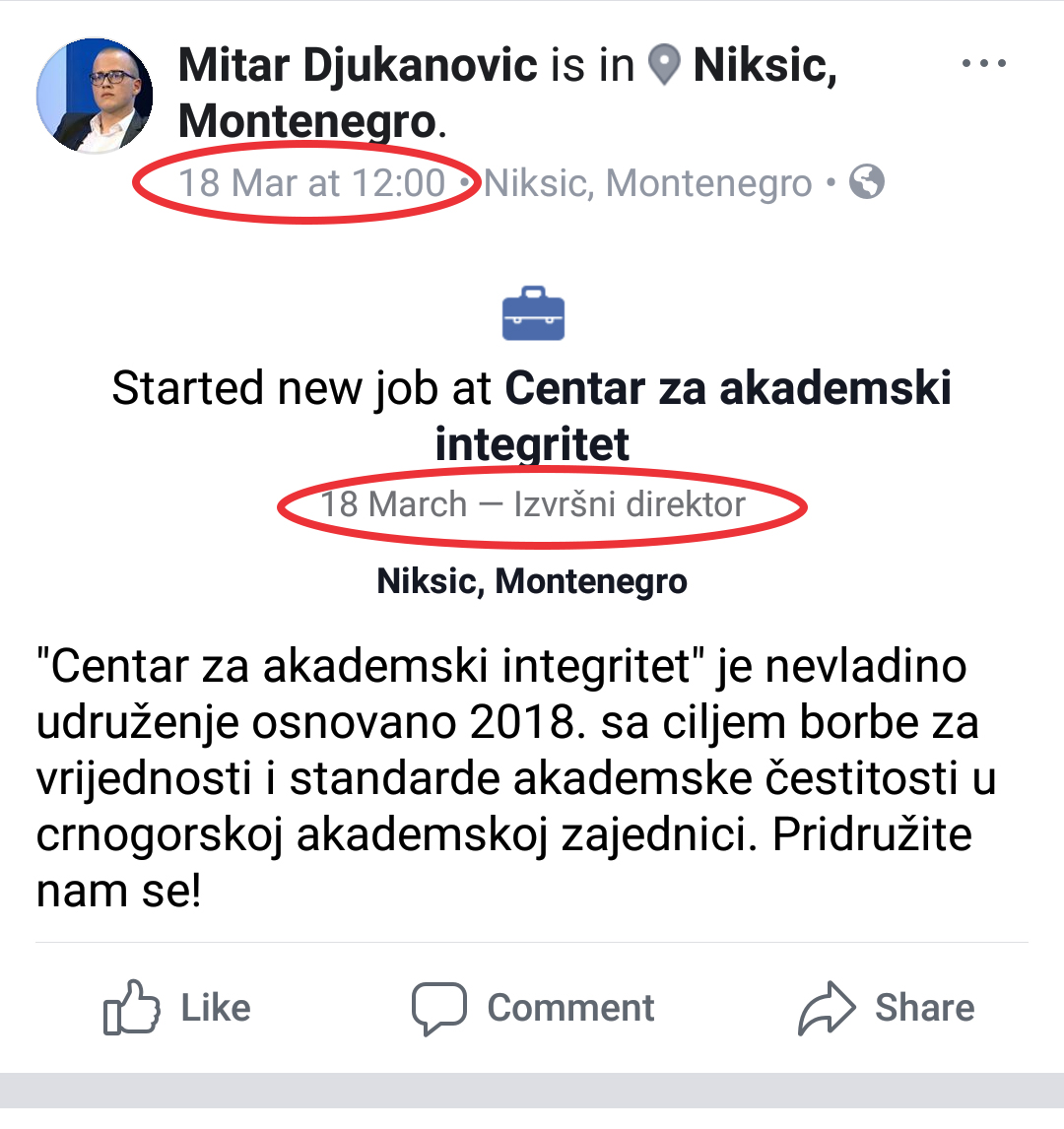 On navodi da je NVO Centar za akademski integritet osnovana, kako se sam Đukanović pohvalio na njegovom FB profilu, 18. marta ove godine. Zvanična Fejsbuk stranica ove nazovi NVO otvorena je 17. aprila 2018. godine u 22.27 sata, dakle prije nepuna tri dana.