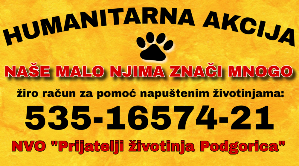 Nevladina organizacija “Prijatelji životinja Podgorica” saopštila je da i u mjesecu maju nastavlja sa humanitarnom akcijom “Naše malo njima znači mnogo” u nadi da će njihov apel za pomoć naići na razumijevanje humanih ljudi, ljubitelja životinja, kao i društveno odgovornih kolektiva, kako bismo svi zajedno pomogli velikom broju napuštenih životinja, koje borave na javnim površinama bez hrane i veterinarske njege.