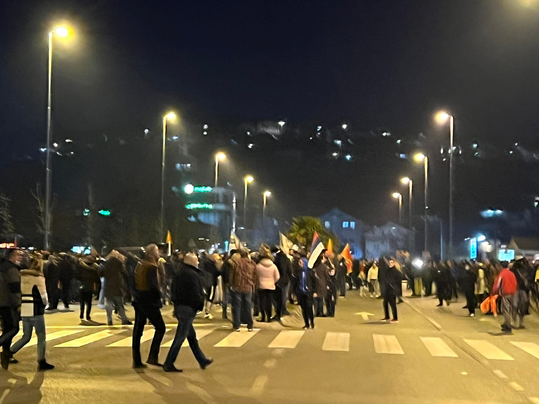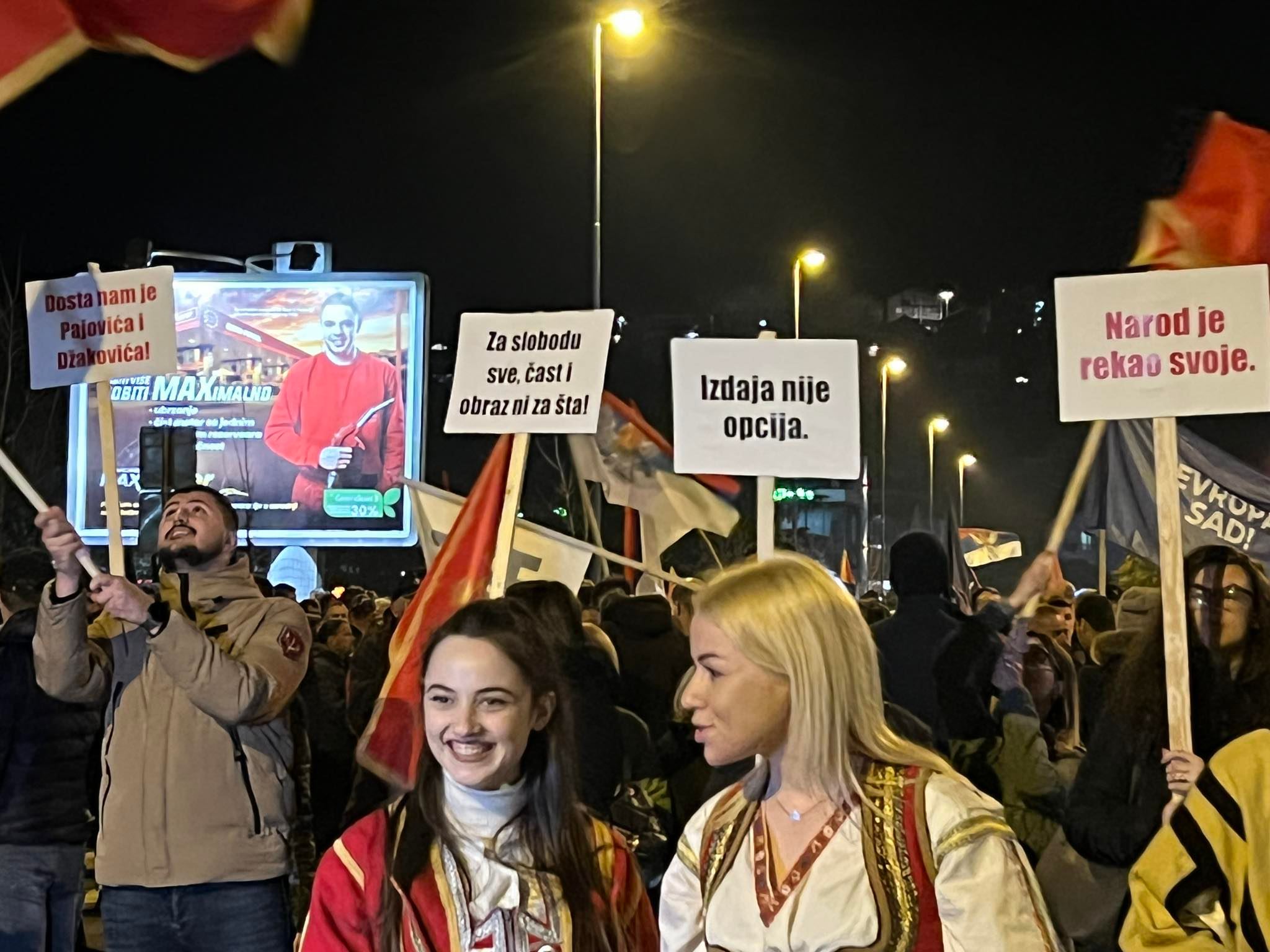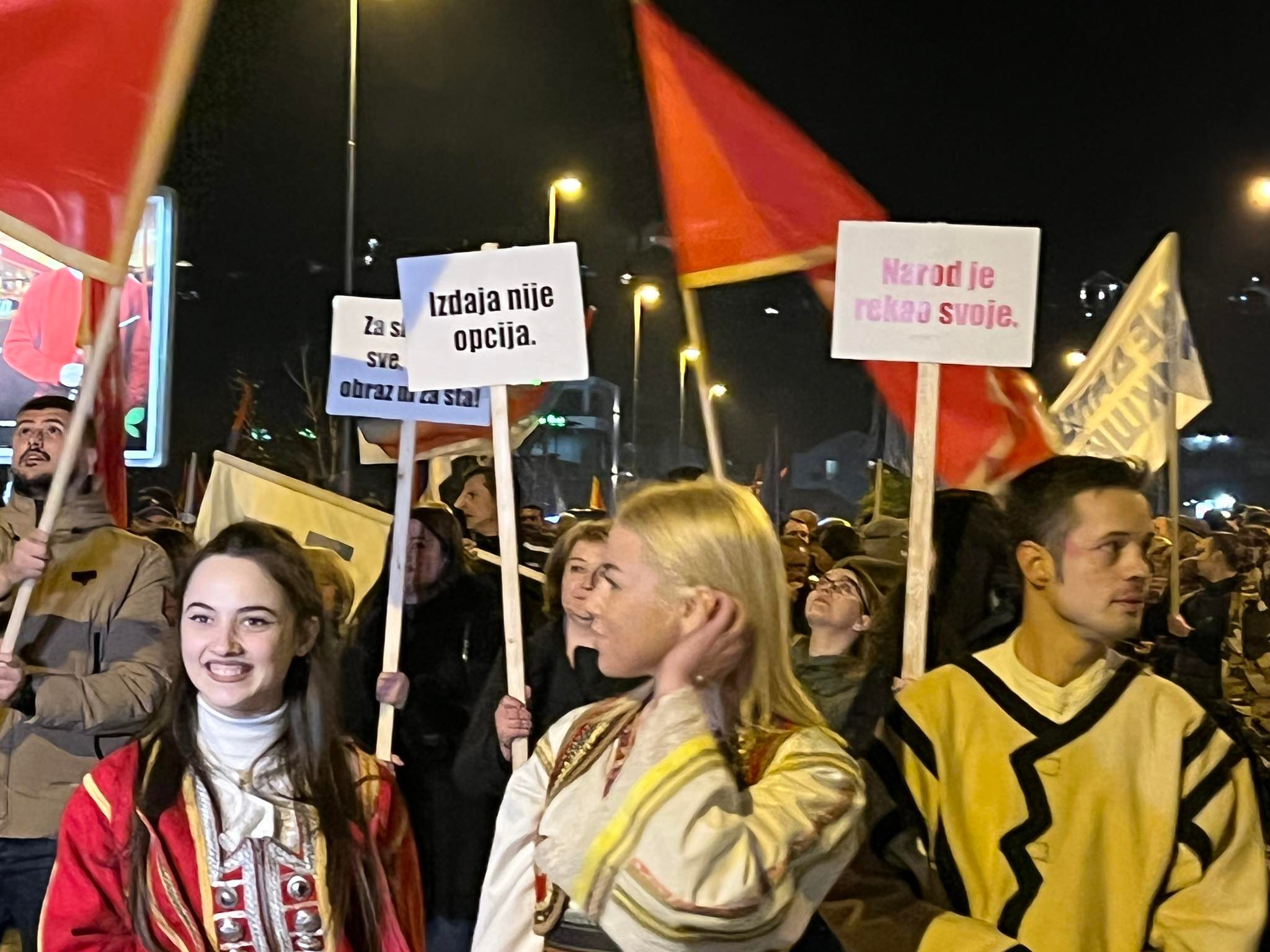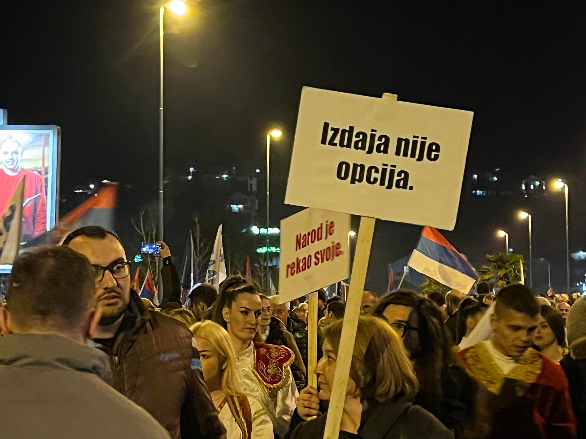 Okupljeni su nosili transparente na kojima piše:”Izdaja nije opcija”, “Za slobodu sve, čast i obraz ni za šta”, “Narod je rekao svoje”…